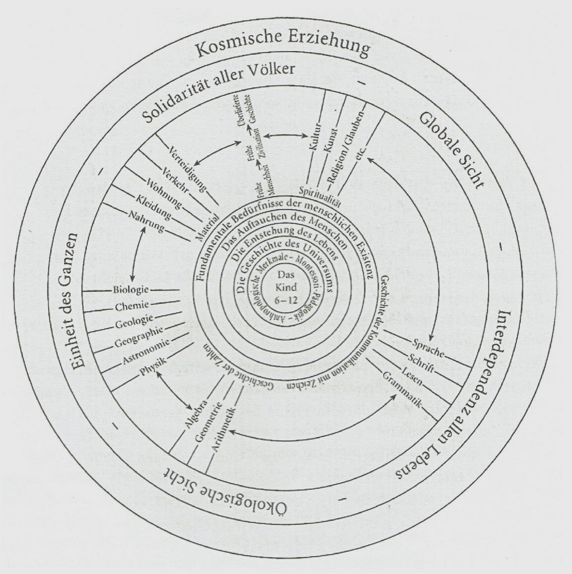 Das 6-12-jährige Kind besitzt eine „hungrige Intelligenz und einen großen Wissensdurst“. Es möchte und soll die großen Zusammenhänge und Interdependenzen (Abhängigkeiten und Bezüglichkeiten) erfahren und verstehen sowie entsprechende Haltungen aufbauen. Grundlage hierfür kann ein universelles Curriculum sein (klicke rechts).